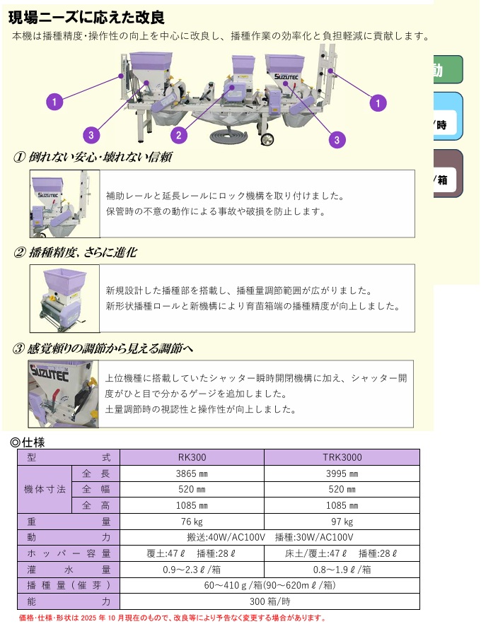 能力 300箱/時 播種量90~395g無段階調節